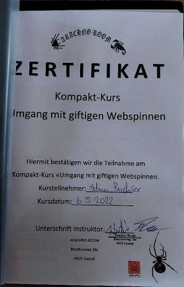 Kompakt-Kurs, Umgang mit giftigen Webspinnen und so weiter. Bei Arachno-Room kann man den Kurs machen.